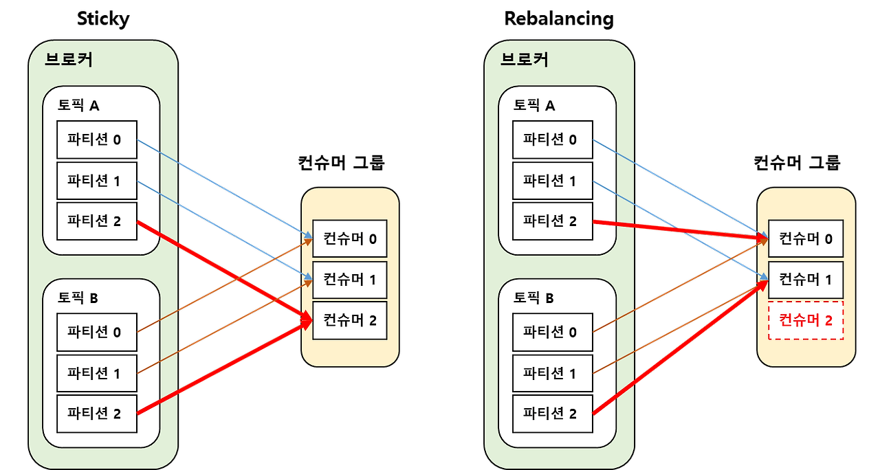 더하여 리밸런싱 이후에는 컨슈머가 이전에 가졌던 파티션을 반드시 다시 가질 수 있다는 보장을 할 수 없다.