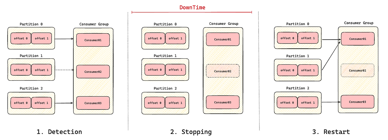 - Restart 단계에서 구독한 파티션이 컨슈머들에게 재할당된다. 이 순간부터 컨슈머들은 각자 재할당받은 파티션에서 메시지를 컨슘하기 시작한다.