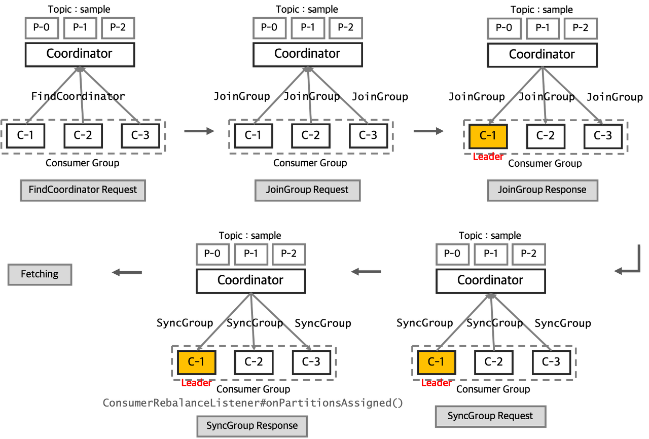 - 동일 group.id 의 여러 컨슈머가 브로커의 Group Coordinator로 접속한다. 그 중 가장 빨리 Group에 Join 요청을 한 컨슈머를 컨슈머 그룹내의 리더 컨슈머로 지정한다.