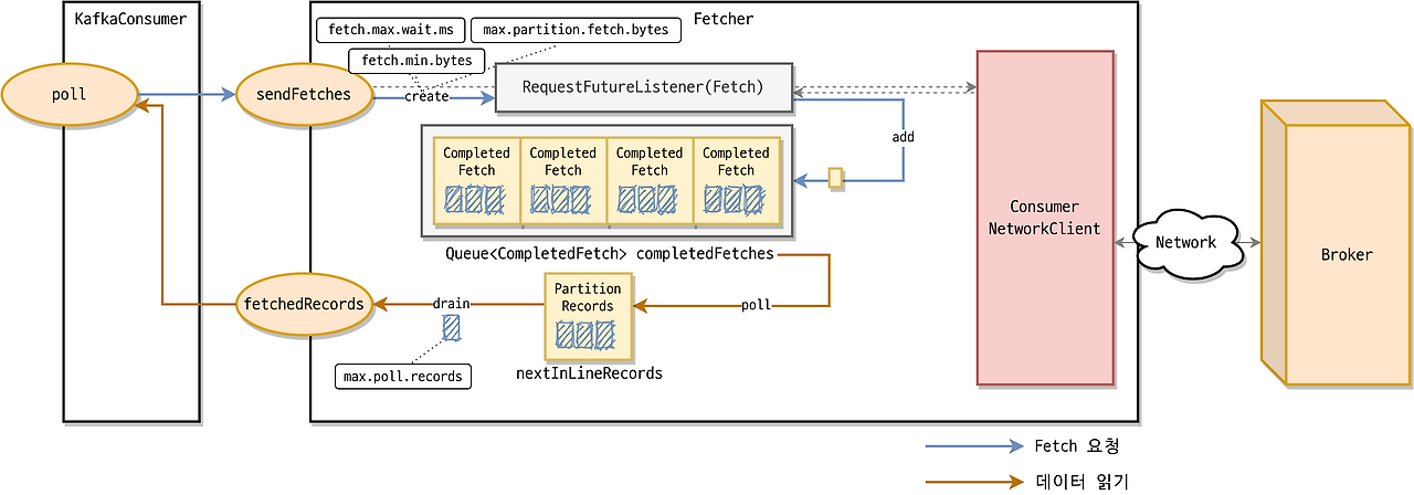 - Linked Queue에 데이터가 없을 경우 Fetcher가 ConsumerNetworkClient에게 데이터를 브로커로 부터 가져올 것을 요청